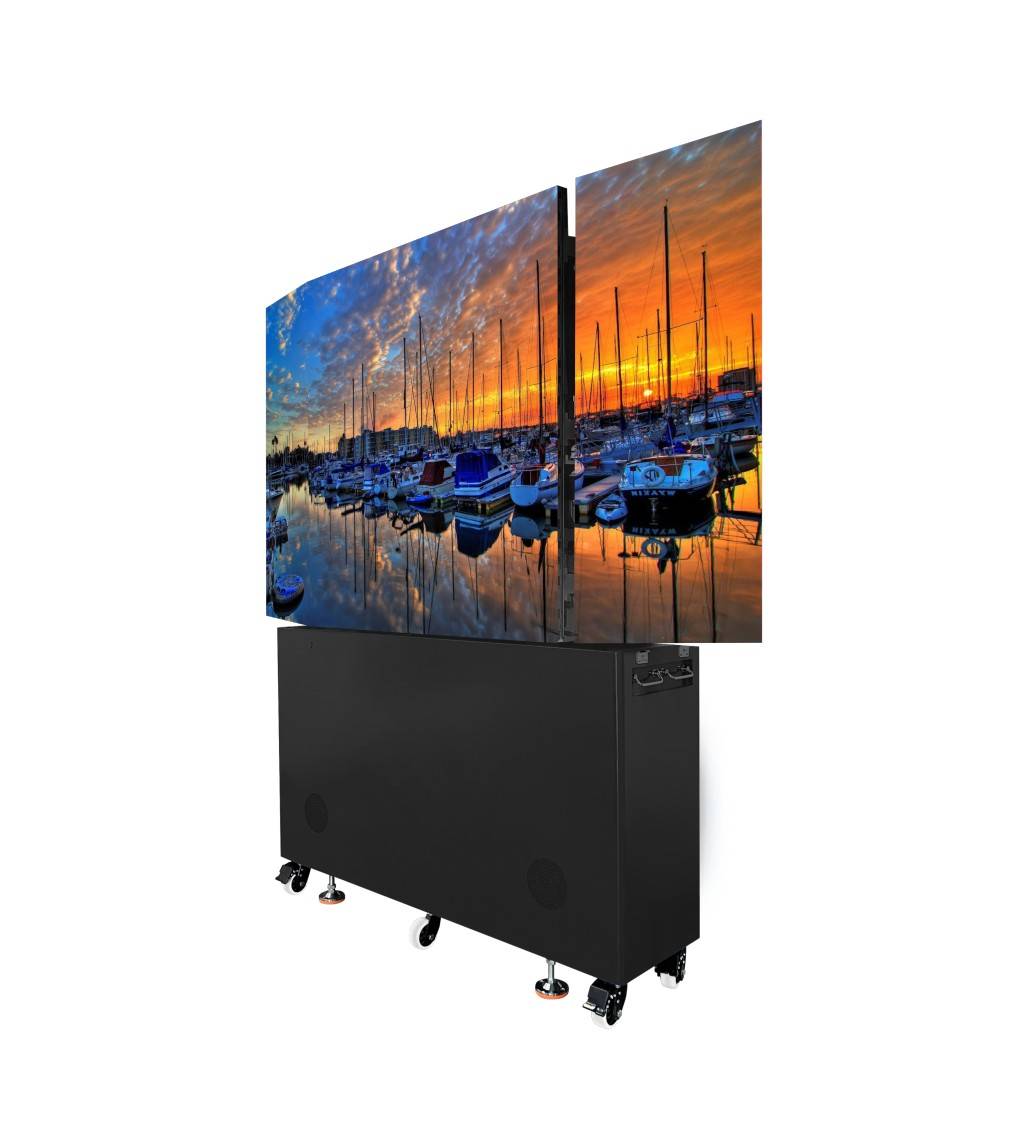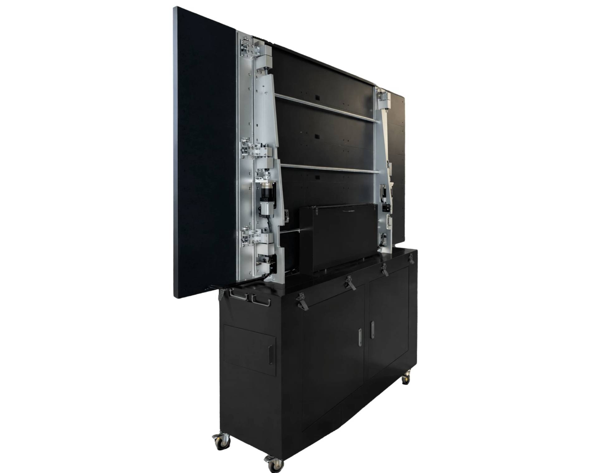 A mobile LED display is a portable screen system ready to go and utilize for events or meetings. In the Janus Series, the configuration features a main screen with wings that fold up and extend using a motorized apparatus from its road case. This configuration allows the setup process to be quick and easy.